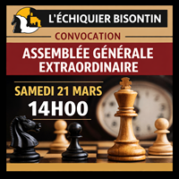 Le second tournoi homologué FIDE de la saison de l’Échiquier Bisontin, ouvert à tous les licenciés (membres du club ou non), débutera le samedi 28 février et se jouera en 7 rondes système suisse, avec une cadence de 60 minutes + 30 secondes par coup.