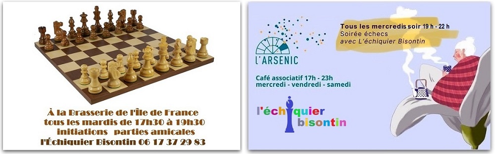 L’Échiquier Bisontin poursuit son aventure en dehors des murs en proposant chaque semaine deux rendez-vous conviviaux autour du jeu d’échecs. Le mardi soir, nous nous retrouvons à la Brasserie de l’Île-de-France, et le mercredi au Café associatif l’Arsenic. Ces moments ouverts à toutes et à tous permettent de jouer, d’échanger, d’analyser des parties ou simplement de découvrir le jeu dans une ambiance détendue.