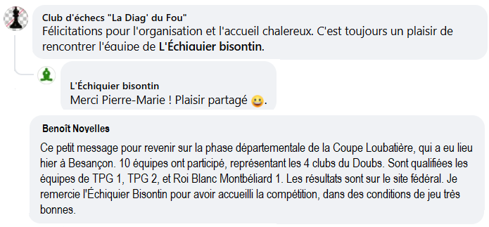 Dimanche 9 novembre, l’Échiquier Bisontin accueillait dans ses locaux de la Maison de Quartier Nelson Mandela la phase départementale de la Coupe Jean-Claude Loubatière, organisée sous l’égide du Comité Départemental du Jeu d’Échecs du Doubs. Cette compétition, ouverte aux joueuses et joueurs dont le classement Elo ne dépasse pas 1800, réunit des équipes de quatre membres pour une journée placée sous le signe de la compétition et de la convivialité. Cette édition a rassemblé dix équipes issues de quatre clubs du Doubs : Le Roi Blanc Montbéliard, La Tour Prends Garde, Le Pion-Tissalien et deux équipes de l’Échiquier Bisontin. Il faut souligner qu’il n’y avait pas eu depuis longtemps autant d’équipes engagées dans cette phase départementale, signe du dynamisme retrouvé des clubs du département.