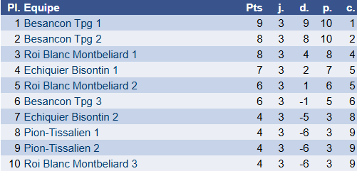 Les matchs se sont disputés en trois rondes à la cadence Fischer de 50 minutes + 10 secondes par coup. Benoît Noyelles, arbitre de la journée et également président du CDJE 25, a assuré un encadrement rigoureux, mais toujours bienveillant, privilégiant l’aspect pédagogique et le plaisir du jeu. Le nombre pair d’équipes a permis d’éviter l’utilisation du système Molter, souvent employé lorsqu’il y a un nombre impair d’équipes. Ce système transforme alors la rencontre en un tournoi individuel, où les joueurs ne s’affrontent plus directement en équipes de quatre, mais selon un appariement global. Le format par équipes a ainsi pu être conservé dans toute sa dimension conviviale, ce qui a grandement contribué à la réussite de la journée.