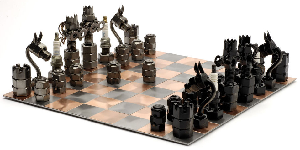 Le jeu d’Échecs se prête à toutes les fantaisies créatrices. Les matériaux les plus divers pourront être utilisé à sa fabrication, bois, carton, verre… et pourquoi pas boulons et écrous. Voici les Échecs du garagiste de Hinz & Kunst.