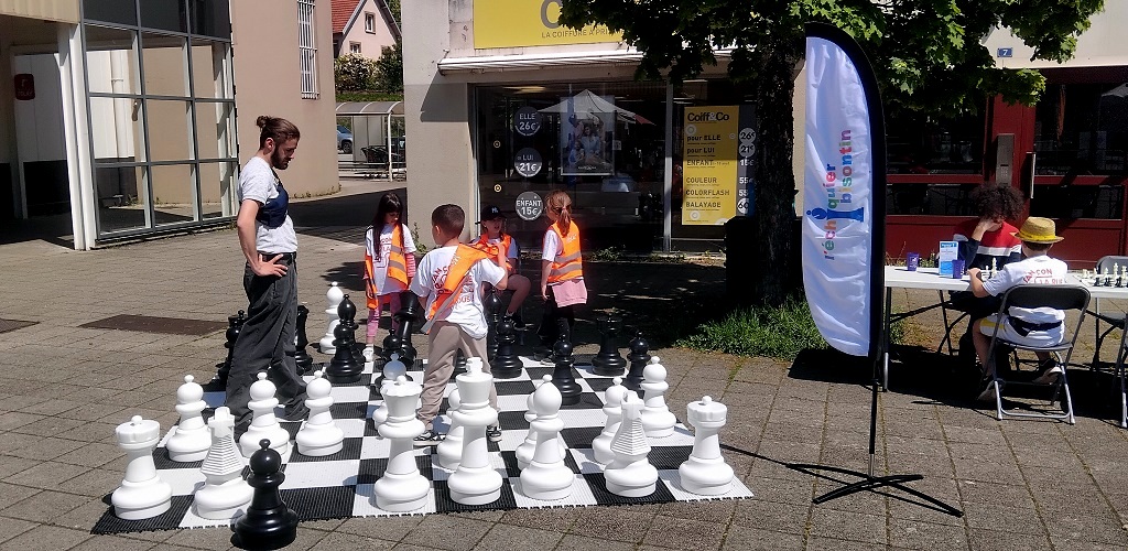 Le mercredi 15 avril, l’Échiquier Bisontin participera de nouveau au Kid’s Run organisé par la Maison de Quartier de Montrapon – Fontaine-Écu et la Direction des Sports de Besançon, dans le cadre de l’opération « La rue est à nous ». L’an dernier, nous avions animé cinq rotations d’ateliers pour des enfants de 7 à 11 ans, de 10 h à 16 h 30, sur le parvis de la Maison de Quartier Pierre de Coubertin. Nous avions fait le choix de doubler la durée prévue pour les ateliers échecs, afin de permettre une véritable initiation. Quatre bénévoles du club étaient mobilisés, ce qui nous a permis d’accueillir les enfants dans de bonnes conditions et de proposer deux formats : découverte sur échiquier géant, très appréciée pour son côté ludique, et parties accompagnées pour les plus initiés.