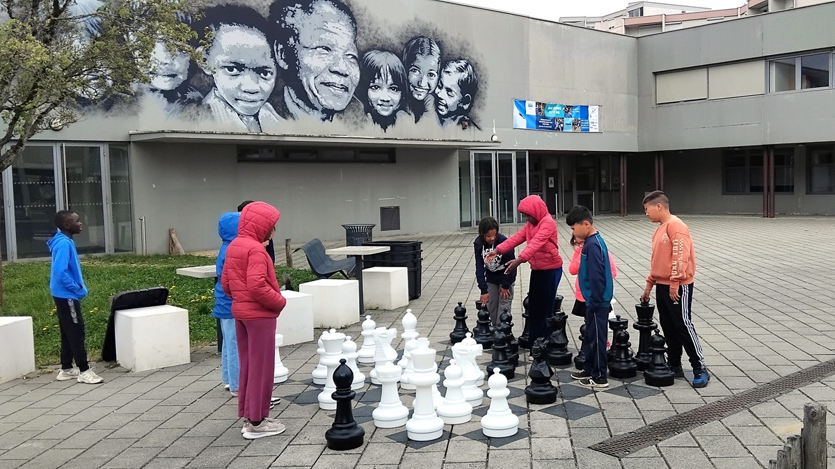 Pour conclure le stage, une partie en concertation sur l’échiquier géant installé sur le parvis de la maison de quartier. Échanges animés de rigueur pour réchauffer une météo  un peu frisquette.