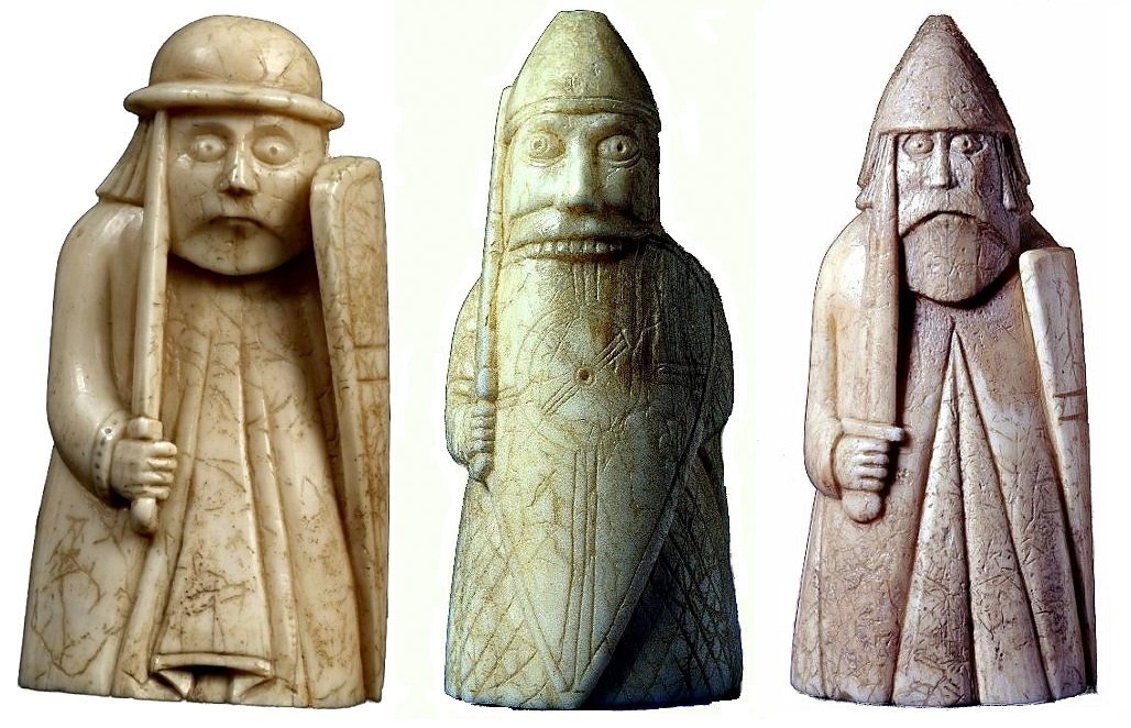 Placé aux extrémités de l’échiquier, le char de guerre du jeu indien devient naturellement le guetteur de l’ost féodal dans les pays scandinaves. Trois des douze warders des pièces de l’Île de Lewis, dont l’un sous l’aspect d’un berserker¹, au regard fou et mordant son bouclier dans une rage de combat. Célèbre dans la mythologie nordique, ils étaient décrits comme des guerriers incontrôlables, combattant férocement, le plus souvent nus ou à peine vêtus, dans un état de transe, ne ressentant pas la douleur et inspirant la crainte à leurs adversaires. Ces caractéristiques ont donné au berserker une réputation surhumaine.