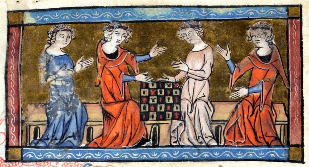 Il est vrai également qu’il existait alors deux manières de jouer aux échecs, avec ou sans dés. Dans le roman Huon de Bordeaux, Huon demande : — Madame, quelle partie voulez-vous jouer ? Jouez-vous aux échecs avec les coups ou avec les dés ? — Jouons le avec les coups, dit la dame d’une voix claire.